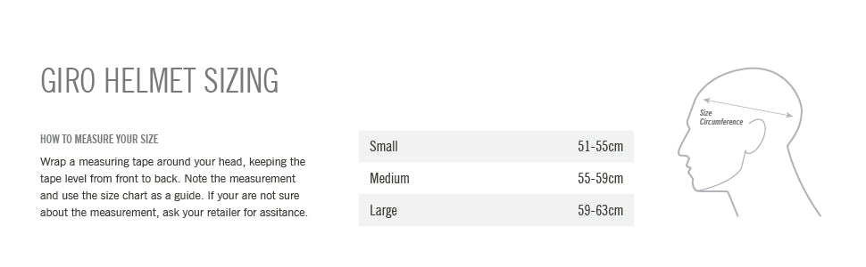 - Sizing: 20”–21.75” / 51–55cm (Small); 21.75”–23.25” / 55–59cm(Medium); 23.25”–24.75” / 59–63cm (Large)